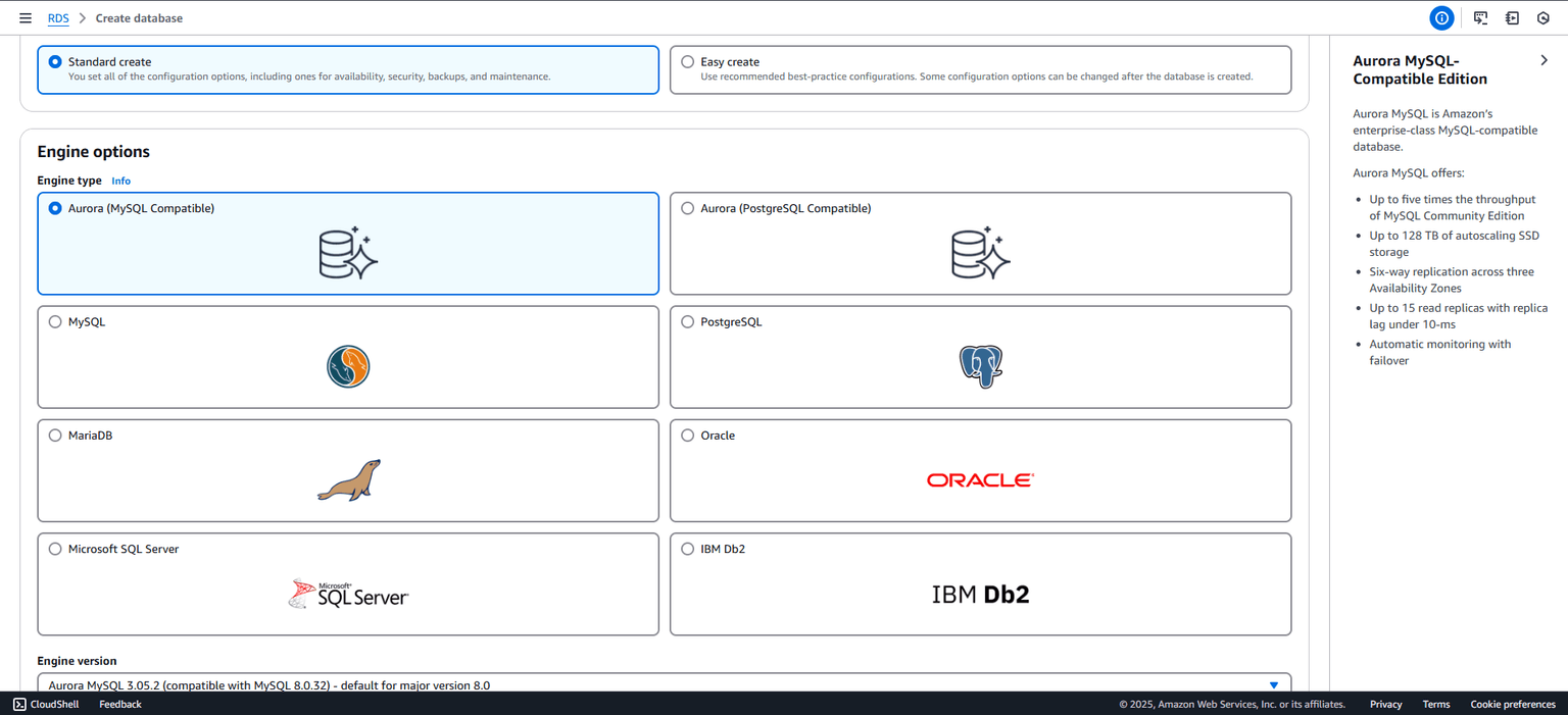 - Chọn phiên bản Aurora phù hợp (ví dụ: Aurora MySQL 3.05.2 (compatible with MySQL 8.0.32) - default for major version 8.0).