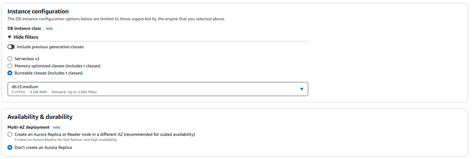 - Chọn DB instance class phù hợp (ví dụ: db.t3.medium cho môi trường production).