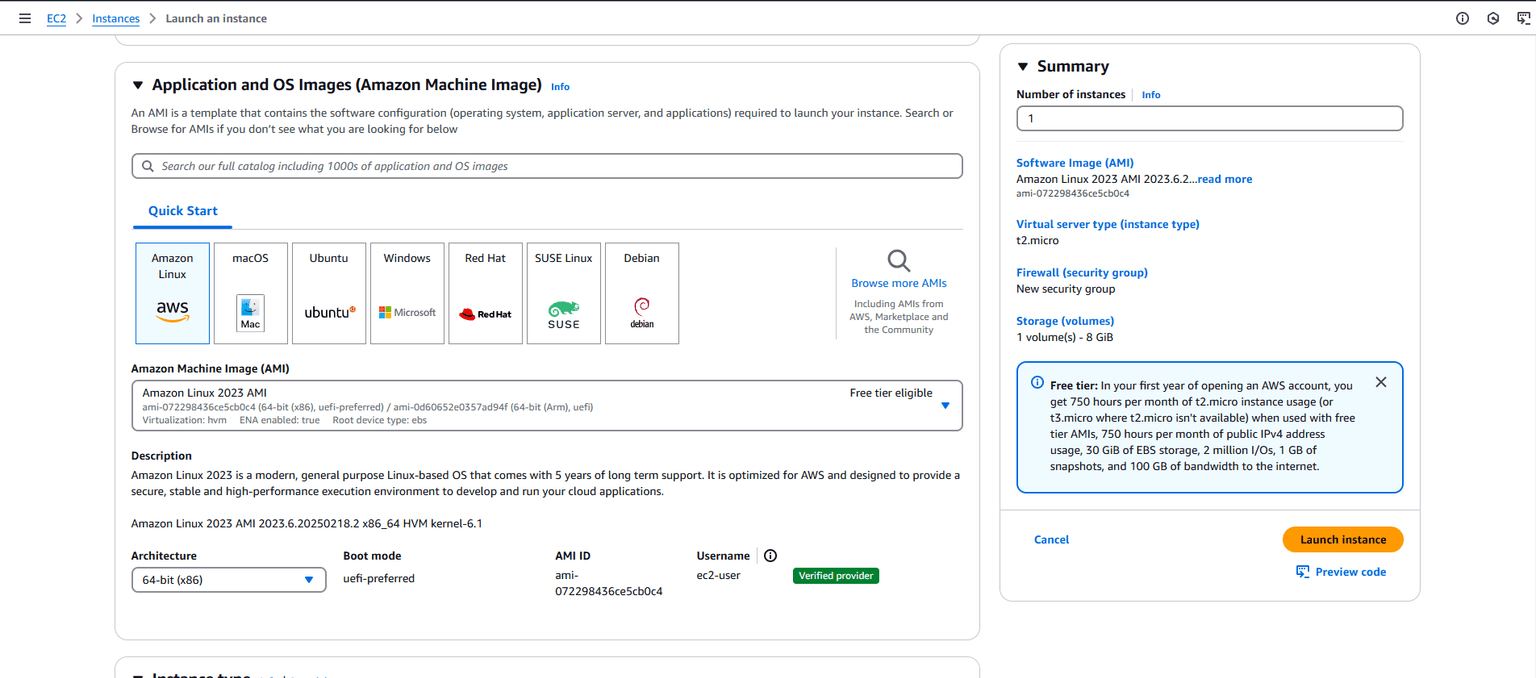 Chọn hệ điều hành Amazon Linux 2 > Amazon Linux 2023 AMI.
