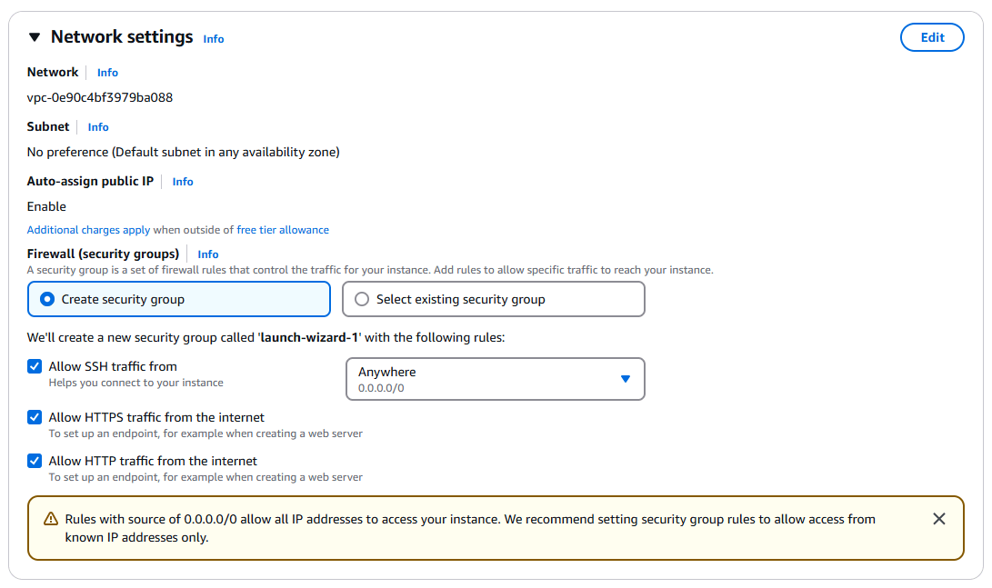 - Mở cổng 22 (SSH) (Allow SSH traffic from) để truy cập từ xa.